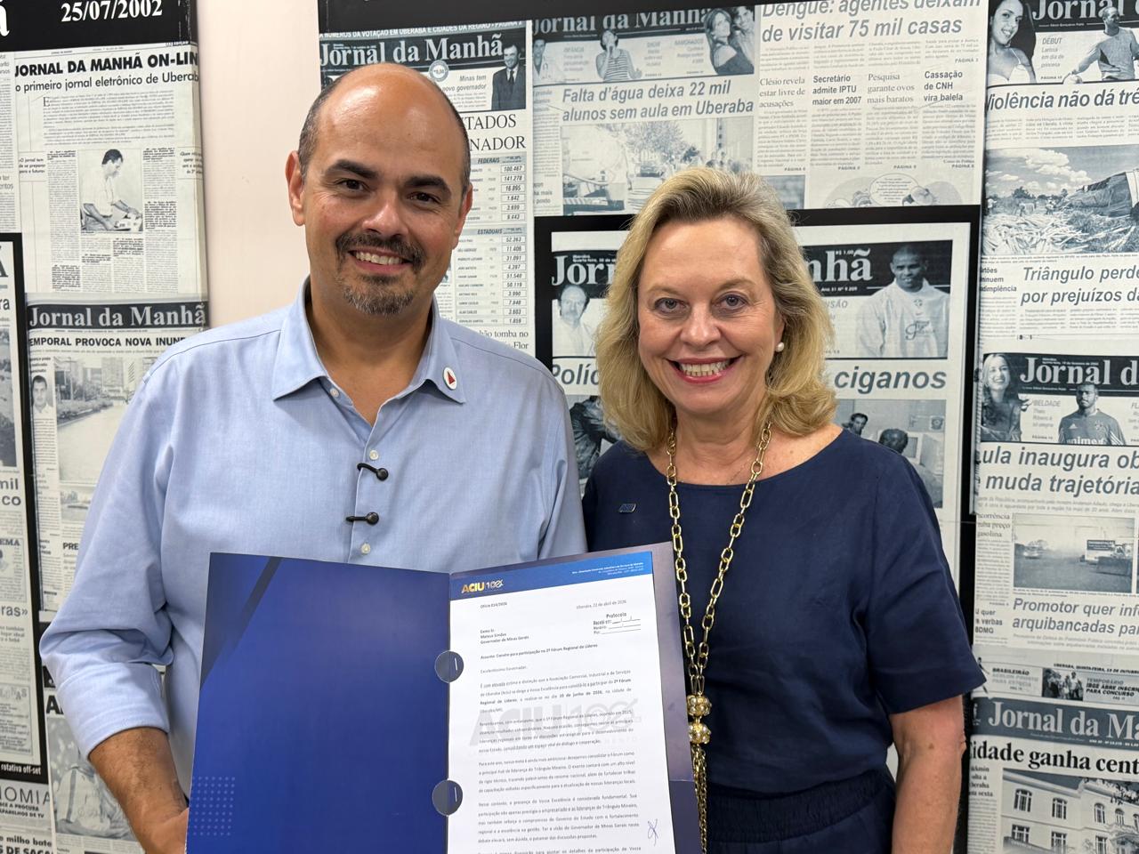 O governador de Minas Gerais foi convidado oficialmente para participar do 2º Fórum Regional de Líderes, promovido pela Associação Comercial, Industrial e de Serviços de Uberaba (Aciu). Mateus Simões recebeu o ofício nesta quarta-feira (22), entregue pela presidente Lídia Prata, durante participação do governador em entrevista à Rádio JM.
