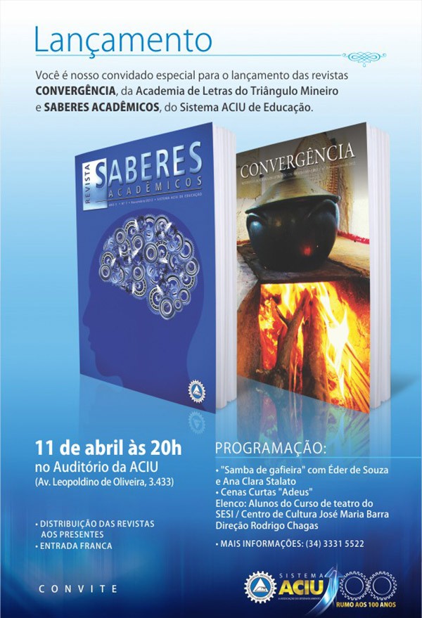Agendada para as 19h30, na sede da ACIU, na Avenida Leopoldino de Oliveira, lançamento das revistas Saberes Acadêmicos e Convergência. Resultado de longa parceria entre a Associação Comercial e Industrial de Uberaba, presidida pelo dinâmico e versátil Manoel Rodrigues Neto, e Academia de Letras do Triângulo Mineiro, sob a presidência do também dinâmico acadêmico Jorge Alberto Nabut, a parceria revela o multifacetado panorama cultural dos nossos vetores acadêmicos, sejam eles científicos ou artísticos.