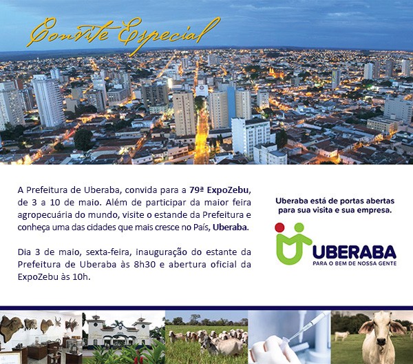 A Prefeitura de Uberaba, convida para a 79ª ExpoZebu, de 3 a 10 de maio. Além de participar da maior feira agropecuária do mundo, visite o estande da Prefeitura e conheça uma das cidades que mais cresce no País, Uberaba.