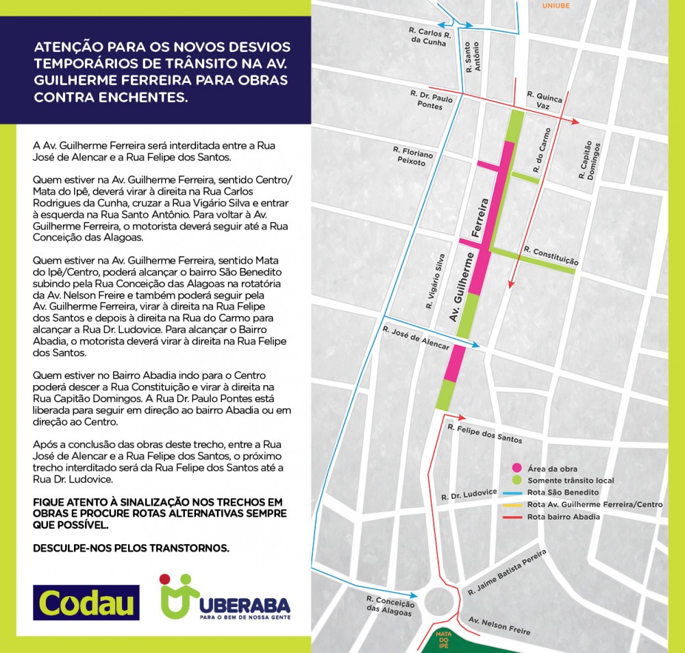 Atenção para os novos desvios temporários de trânsito na av. Guilherme Ferreira para obras contra enchentes.